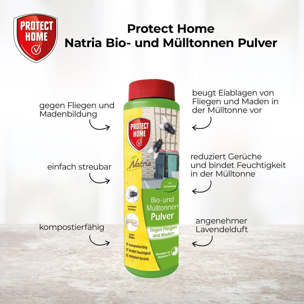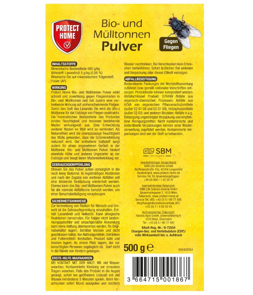 Das Protect Home Bio- und Mülltonnen Pulver verhindert Madenbildung und Gerüche. Gegen Eiablagen und Madenbildung in der Mülltonne. Bei bereits erfolgter Madenbildung trocknet das Pulver diese aus und stoppt den Madenbefall schnell und nachhaltig.