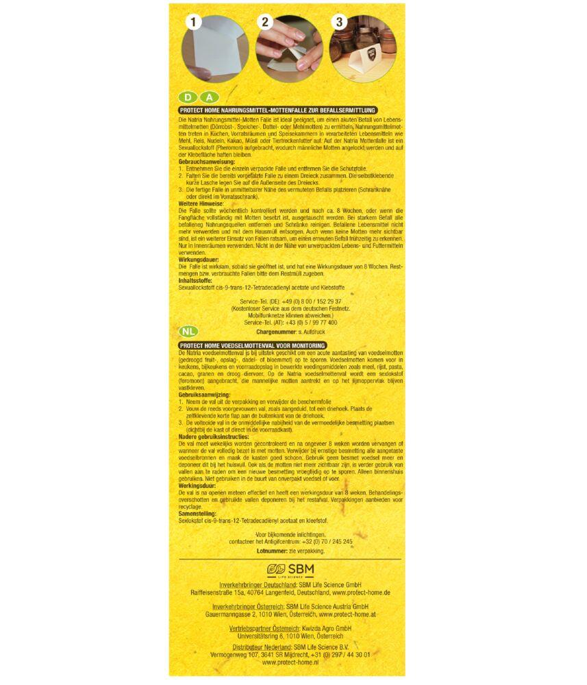 Anwendung & Dosierung: Klebefalle in der Nähe gefährdeter Lebensmittel aufstellen. Wenn der Mottenbefall festgestellt wird, Lebensmittel vernichten und entsprechende Maßnahmen ergreifen.