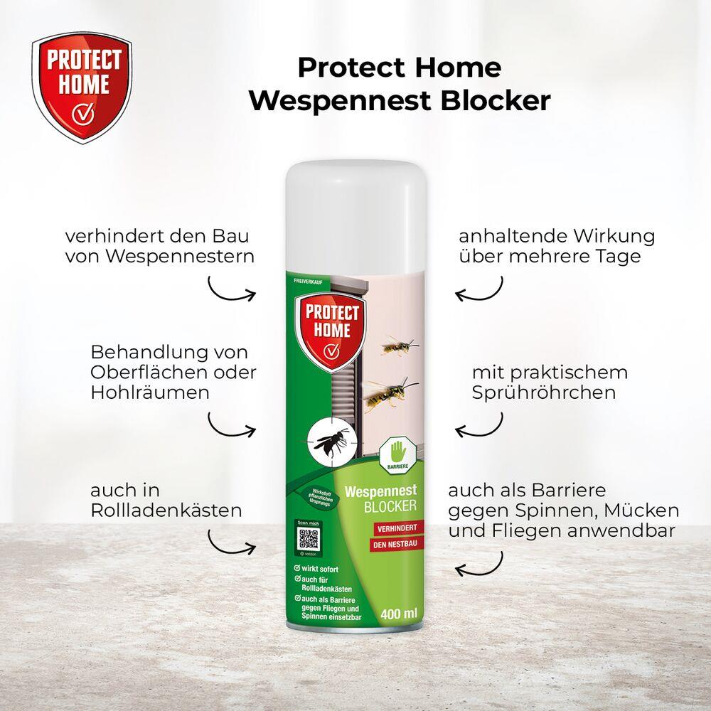 Der Protect Home Wespennest Blocker verhindert den Bau von Wespennester. Dort, wo der Bau eines Wespennests beobachtet wird oder sich aus Erfahrung gerne Wespen niederlassen, wird das produkt aufgesprüht. Die behandelte Fläche wird somit fortan von Wespen gemieden. Dank Sprühröhrchen ist der Wespennest Blocker auch ideal für die präventive Behandlung von Rollladenkästen und sonstigen schwer zugänglichen Stellen, wo sich Wespen potentiell ansiedeln. Bei Einsprühen des Fensterrahmens: auch zur Abwehr von Spinnen, Mücken und Fliegen bei geöffnetem Fenster anwendbar.