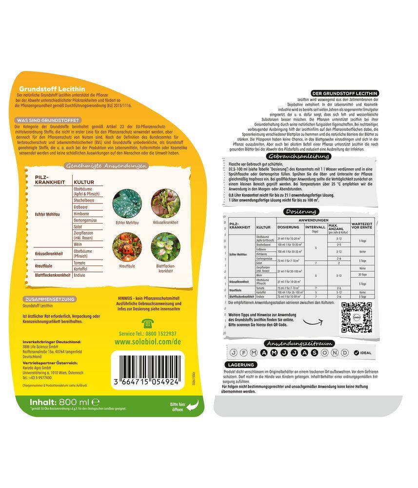 Der Solabiol® Grundstoff Lecithin unterstützt die natürliche Abwehr von Pilzkrankheiten. Bei rechtzeitiger, vorbeugender Ausbringung wird die Sporenkeimung verschiedener Blattpilze gehemmt und die natürliche Barriere der Blätter gestärkt. Genehmigte Anwendung als: Fungizid gegen Blattfleckenkrankheit, Mehltaupilze, Kräuselkrankheit, Kraut- und Braunfäule.